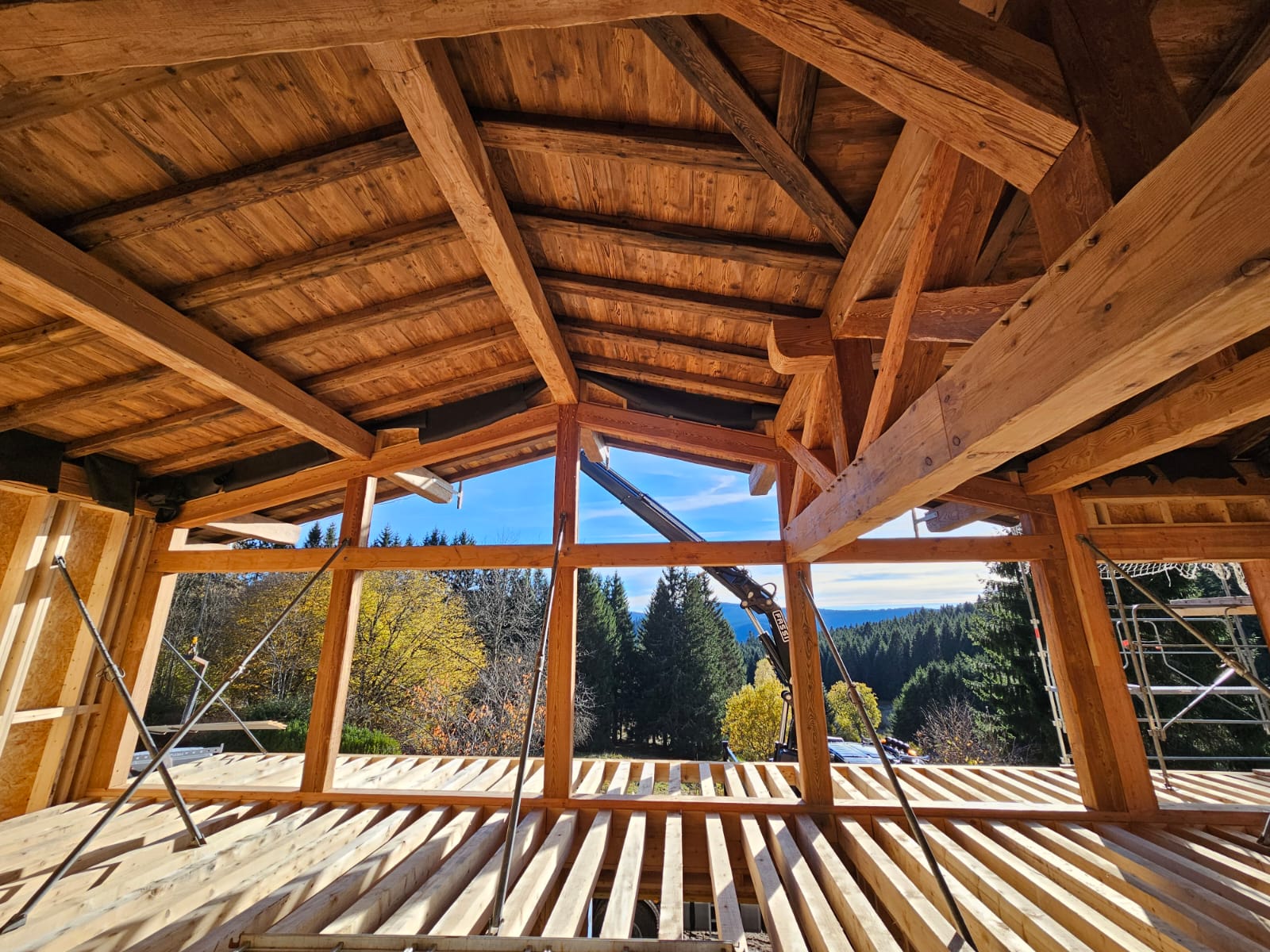 L’étuvage apporte une homogénéité de teinte et une chaleur visuelle remarquable, tout en conservant l’authenticité du bois massif. La combinaison entre structure porteuse et parement crée un ensemble cohérent et puissant, où la charpente n’est plus dissimulée mais pleinement assumée comme un choix esthétique fort.