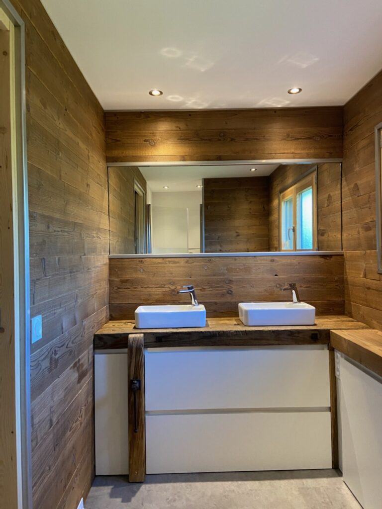 Dans cette salle de bain, la gamme Morille Vintage se distingue par des lames de parement en Épicéa étuvé pré-vieilli brossé, en section 20/175 mm. Ces lames apportent une texture élégante et une teinte chaleureuse, créant une atmosphère authentique et raffinée.